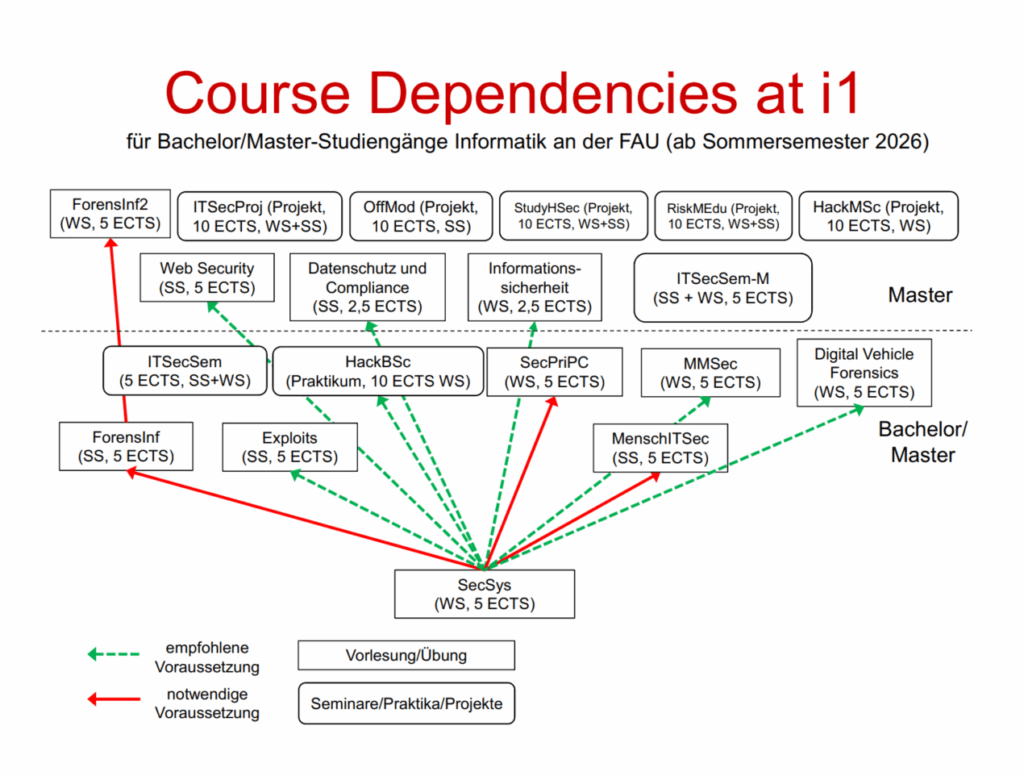 Im Pflichbereich des Bachelorstudiums Informatik bietet der Lehrstuhl das Modul “Sichere Systeme” (SecSys, 5 ECTS) an. Dies ist das grundlegende Einführungsmodul in IT-Sicherheit an der FAU und auch als Wahlveranstaltung für Studierende anderer Fachrichtungen geeignet.